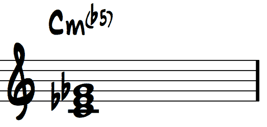 The first step in finding the notes of the C minor b5 chord is to remember the notes of the C major chord, C, E and G. Secondly, we flatten the third degree of the chord which transforms it into a minor chord, E becomes Eb. The final step to make a chord minor b5 is to flatten the fifth degree, G becomes Gb. The C minor b5 chord is composed of C, Eb and Gb.