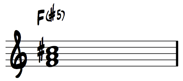 To find the notes of the F augmented chord, you have to remember the notes of the F major chord, F, A and C. Then, sharpen the fifth degree, C becomes C#. The F augmented chord is composed of F, A and C#.