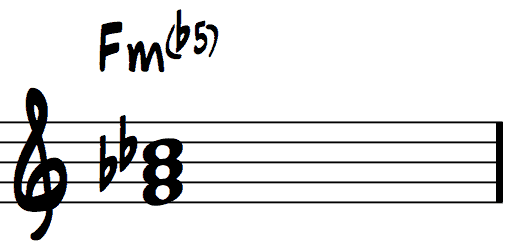 To find the notes of the F minor b5 chord, you need to remember the notes of the F major chord, F, A and C. We start by flattening the third degree, which transforms the major chord into a minor chord, A becomes Ab. Then we flatten the fifth degree to make the chord minor b5, C becomes Cb. The F minor b5 chord is composed of F, Ab and Cb.