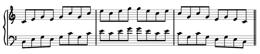 Prenons l’accord de do majeur. À la place de jouer do, mi et sol tous en même temps, il faut jouer do, mi puis sol un à la suite de l’autre.