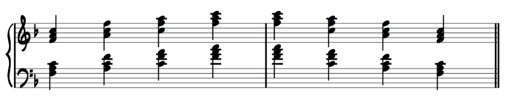 Essayons avec l’accord de fa majeur. L’ordre des notes de la position fondamentale est fa, la et do. L’ordre des notes du premier renversement est la, do et fa.