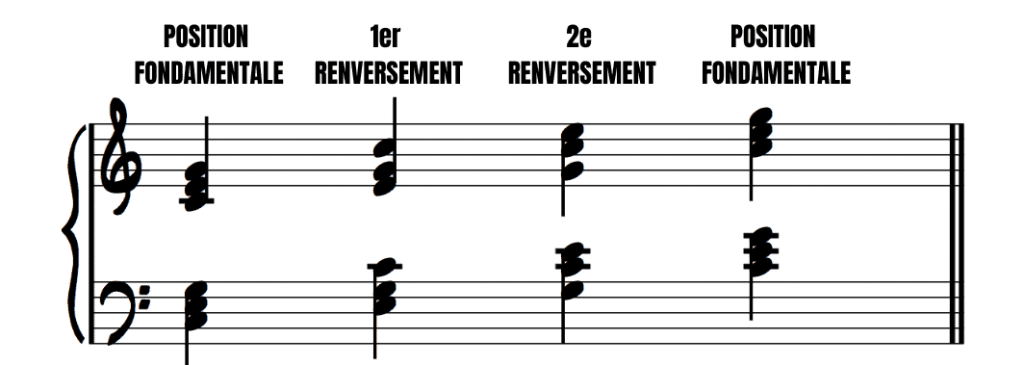 Un renversement d’accord est la modification de l’ordre des notes d’un accord. Une triade peut être jouée de trois façons différentes puisqu’elle est composée de trois notes. Les trois possibilités sont la position fondamentale, le premier renversement et le deuxième renversement.