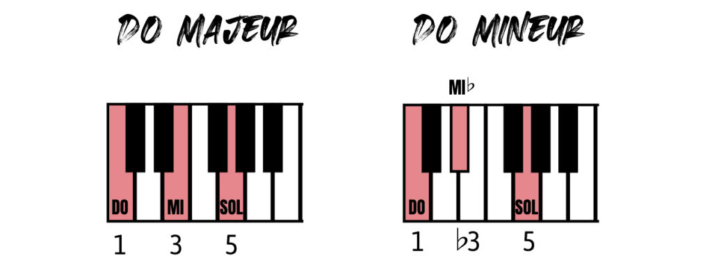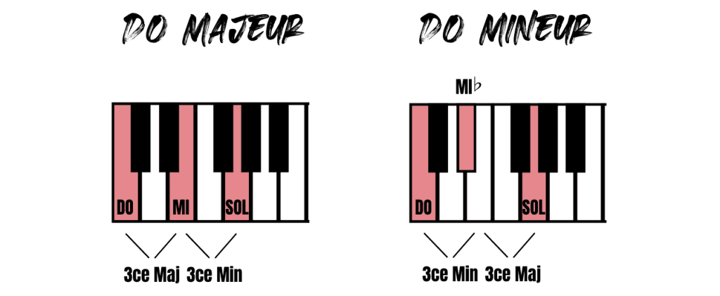 La première différence qu’on peut entendre c’est au niveau de la sonorité. Les accords majeurs sonnent joyeux alors que les accords mineurs sonnent tristes.